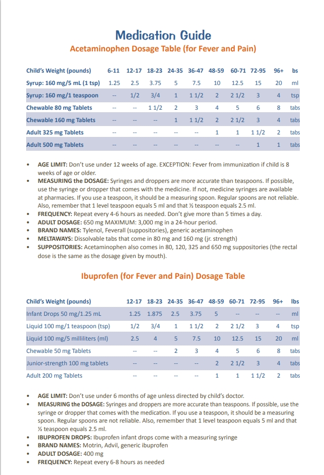 Find the correct dosage of Tylenol (Acetaminophen) and Ibuprofen (Motrin or Advil) to give your child based on weight and age using the Focus Pediatrics child dosage chart.